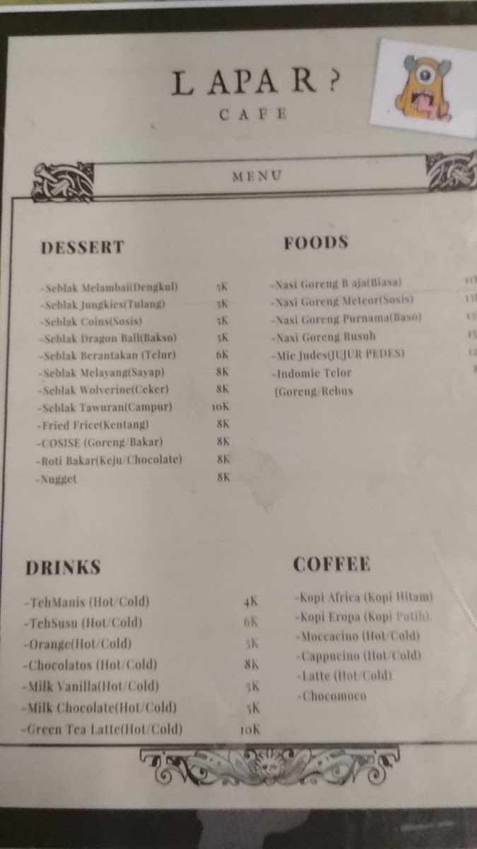 Welcome to 'L' apa 'R' Cafe, a delightful spot located in the heart of Karawang, Indonesia. This cozy cafe offers a simple yet satisfying menu that caters to diverse tastes. Highlights include nasi goreng and an array of seblak variations, perfect for those craving local flavors. Coffee enthusiasts will appreciate the selection of both hot and cold brews, making it an ideal place for a caffeine fix.
